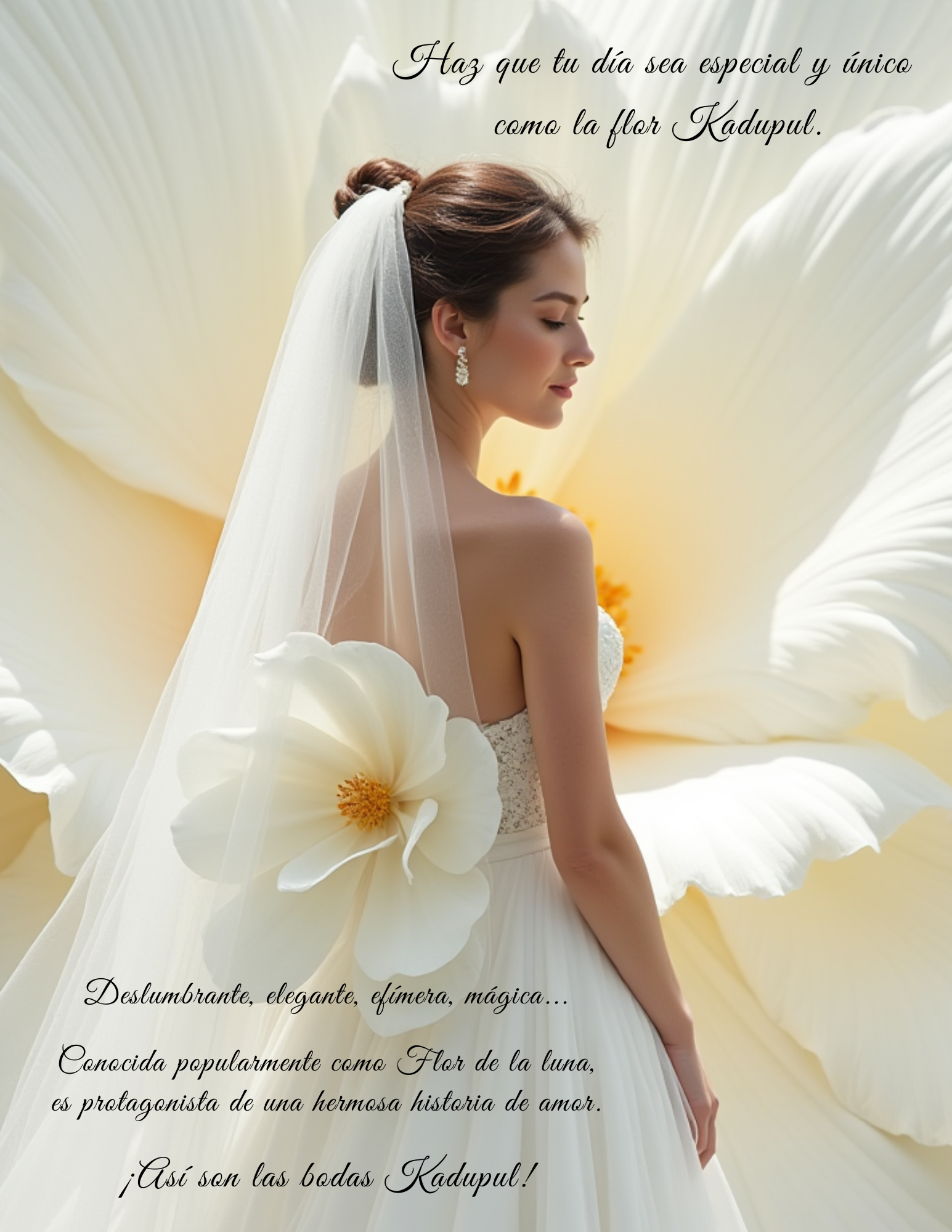 Como la flor Kadupul, que solo florece una vez al año y deja una huella imborrable, creemos que cada boda es un momento tan efímero como extraordinario. Un instante lleno de emoción, amor y magia que merece ser vivido intensamente y sin preocupaciones.